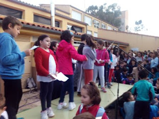 Comenzaron leyendo los niños y niñas de Primaria, desde 1º a 6º... el texto del Pregón del Día de las Bibliotecas Escolares, a nivel nacional, que es de Diego Arboleda, Premio Nacional de Literatura Infantil y Juvenil.