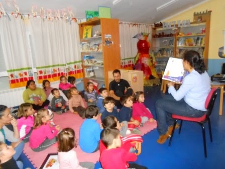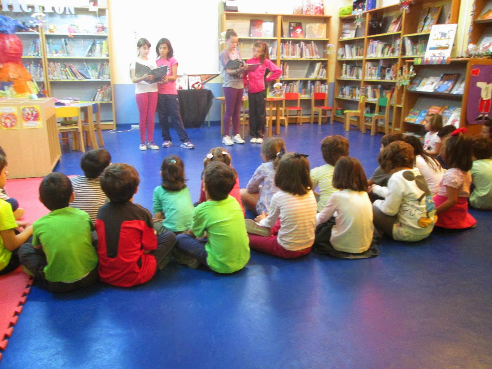 Para los niños y niñas de primero A, se decidieron por el cuento de "Los tres cerditos". Fue una intervención magnífica. Al llegar habían ambientado la biblioteca bajando las persianas y se encontraban en posición de lectura. Su excepcional entonación y seguridad logró mantener la atención de los más pequeños de primaria.